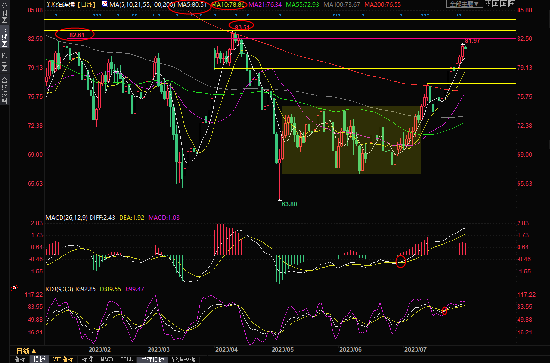 日线级别:单边上涨;短期均线多头排列,MACD金叉继续向上发散,KDJ高位钝化,在失守10日均线78.86前,后市偏向多头,有望继续试探4月份高点83.51附近阻力,该位置也是2022年11月份中旬以来的高点,阻力相对较强,而且油价短线涨幅较大,需要提防冲高受阻后震荡调整的可能性,下方初步支撑在5日均线80.51附近,10日均线目前在78.86附近,如果意外下破10日均线,则削弱后市看涨信号。