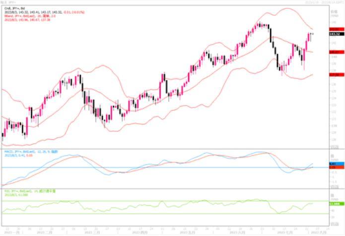 有效穿越布林带中轨并向上轨渐渐逼近,技术指标开始穿越均衡线向上延展,显示美元多头力道在加强。不过近期的美元/日元上升斜率过大,短线需注意出现震荡调整的风险。短线调整性的回落只要企立在141之上,恐怕后市走向还是有望冲击年内高位145附近的水平。