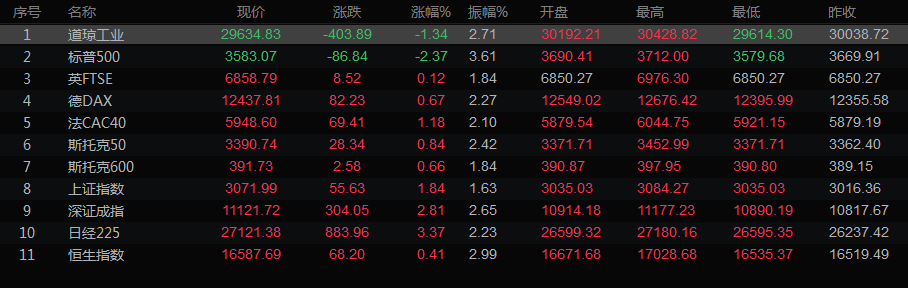 美股收盘情况:道琼斯工业股票指数下跌1.34%,至29634.83点;