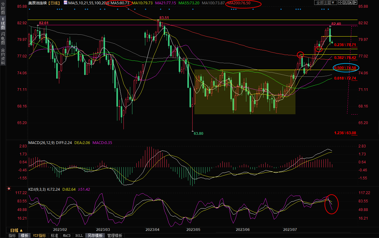 单边上涨后回落;油价持续上涨后在强阻力位附近遇阻后回落,高位类似“上吊线”K线后紧跟大阴线,形成类似“吞没看空”的顶部信号,连续失守5日均线和10日均线,KDJ高位死叉,油价短线见顶的可能性较大,后市起码面临进一步回调风险,初步支撑参考7月25日低点78.27附近位置,7月13日高点支撑在77.31附近,较强的支撑在200日均线76.59附近,这一轮涨势的38.2%回撤位支撑也在该位置附近,如果失守该支撑,则增加后市看空信号。