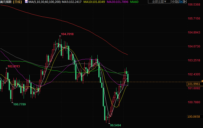 美元指数下跌0.459%,录得三周来最大单日跌幅。美元在周四攀升至102.84,为7月7日以来最高。