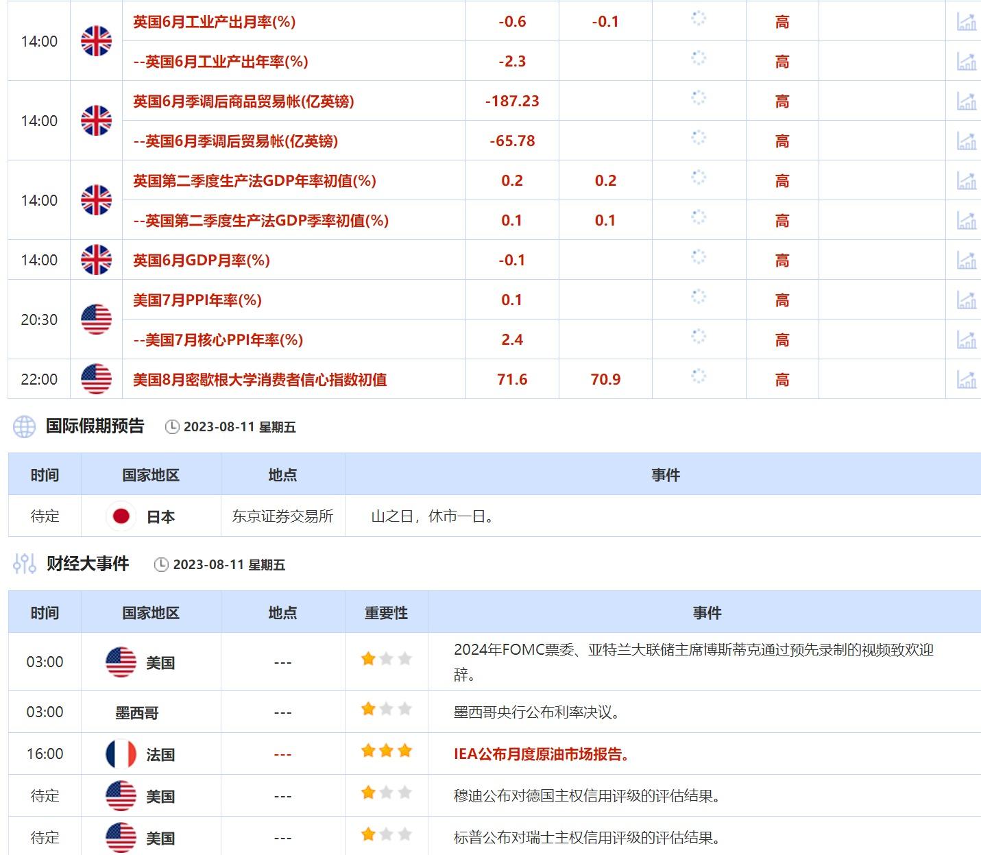 ⑤8月11日(周五)关键字:英国6月工业产出月率,美国7月PPI年率