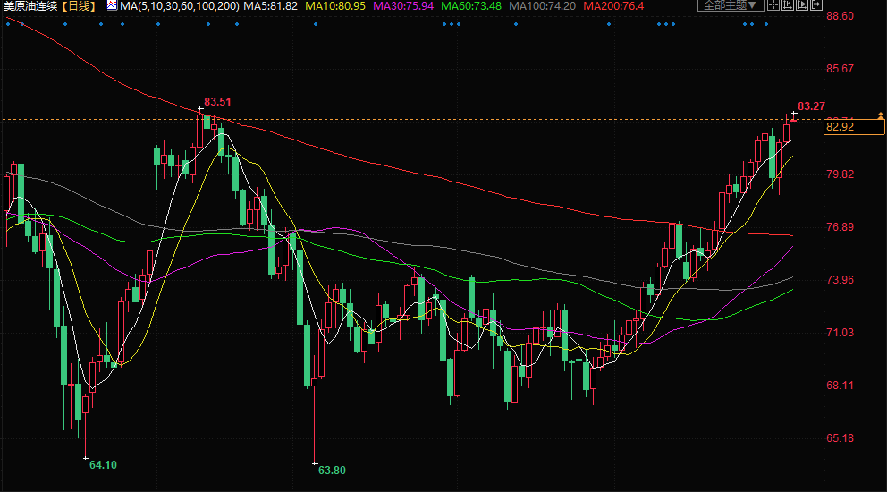 美原油交投于82.93美元/桶附近;油价上周连续第六周周线走高,此前最大产油国沙特阿拉伯和俄罗斯将削减供应的期限延长至9月,加剧了供不应求的担忧。