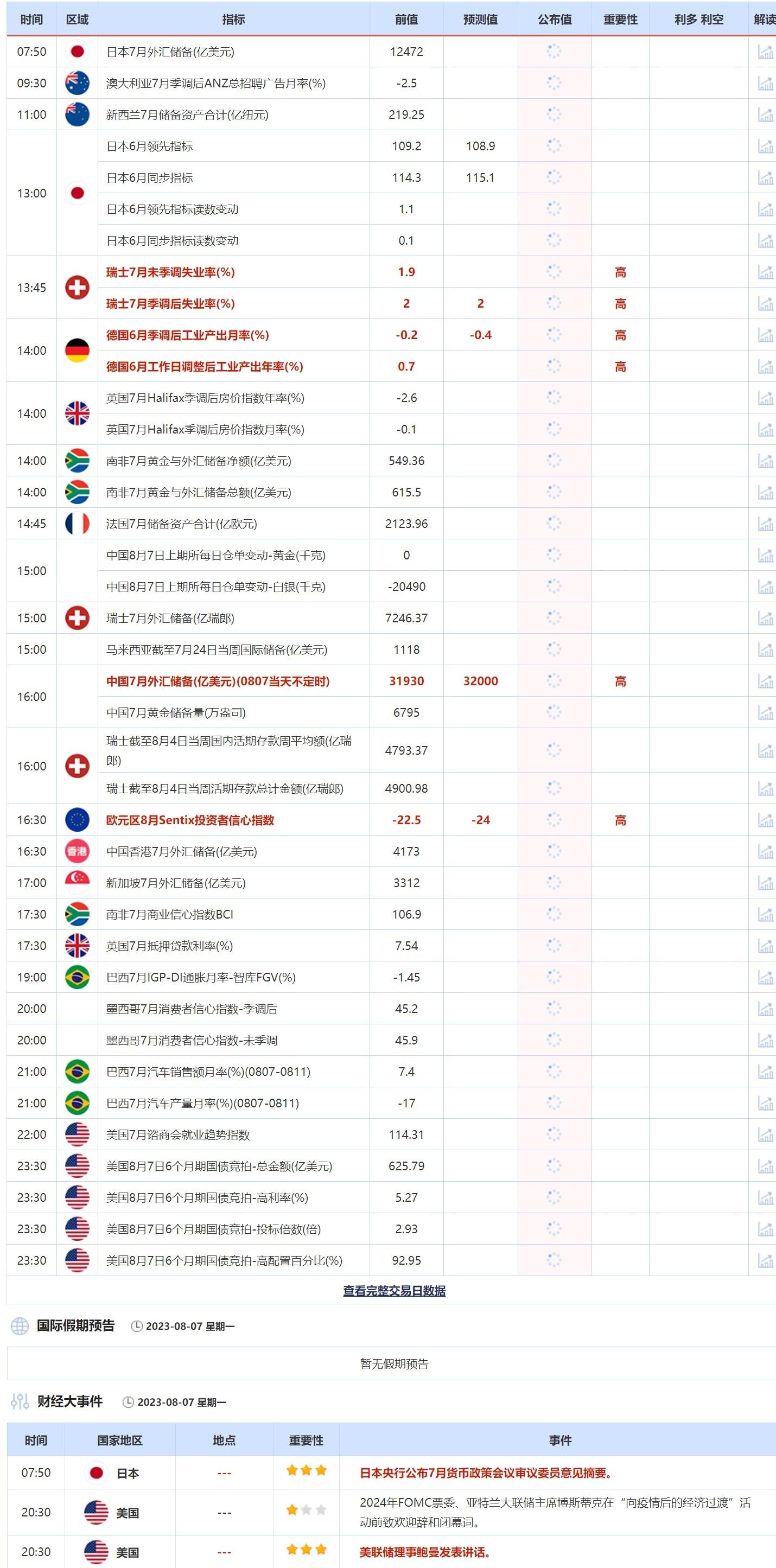16:00 中国7月外汇储备(亿美元)(0807当天不定时) , 前值 31930 , 预期值 32000 , 公布值:待发布16:00 中国7月黄金储备量(万盎司) , 前值 6795 , 预期值 -- , 公布值:待发布