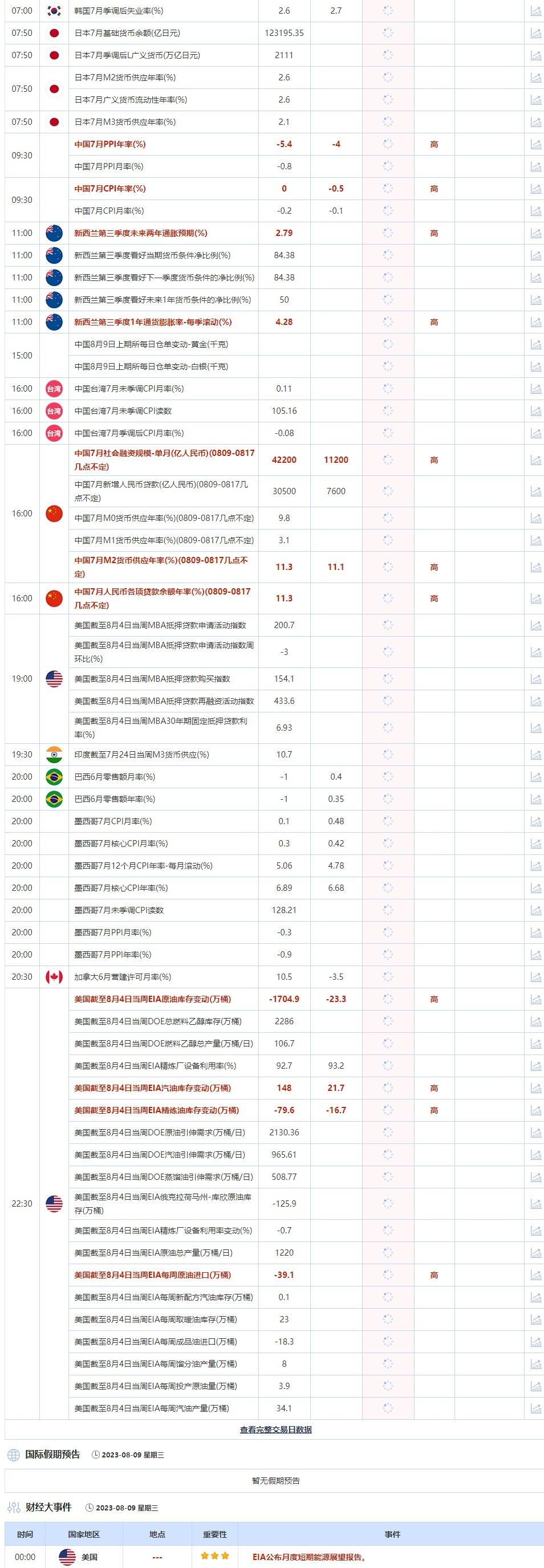 16:00 中国7月社会融资规模-单月(亿人民币)(0809-0817几点不定) , 前值 42200 , 预期值 11200 , 公布值:待发布16:00 中国7月新增人民币贷款(亿人民币)(0809-0817几点不定) , 前值 30500 , 预期值 7600 , 公布值:待发布