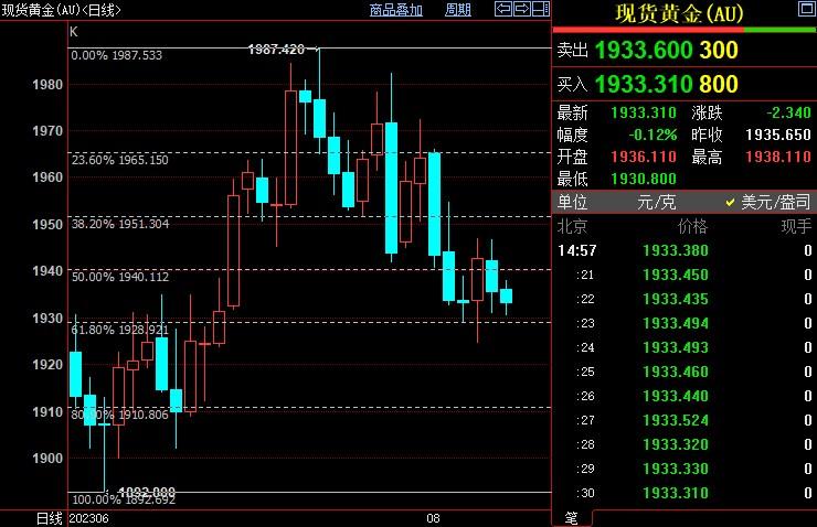 现货黄金下跌0.28%至1930.90美元/盎司;COMEX期金主力合约下跌0.24%至1965.3美元/盎司;