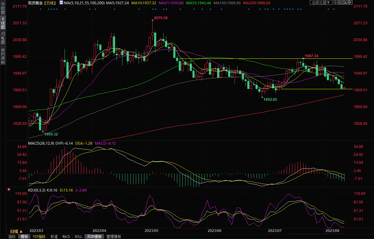 整体来看,本周美元持续受到避险资金的涌入,盖过了市场对黄金的避险需求,金价持续承压,而且黄金技术面看空信号进一步增加,短线金价可能会进一步下探1900关口附近支撑,200日均线支撑也在该位置附近;基本面方面,需要重点关注美国7月份CPI数据的表现。考虑到市场对美债收益率的长线看空预期,金价的下行空间料将受到限制,盘中需要提防多空来回拉锯的行情。北京时间10:05,
