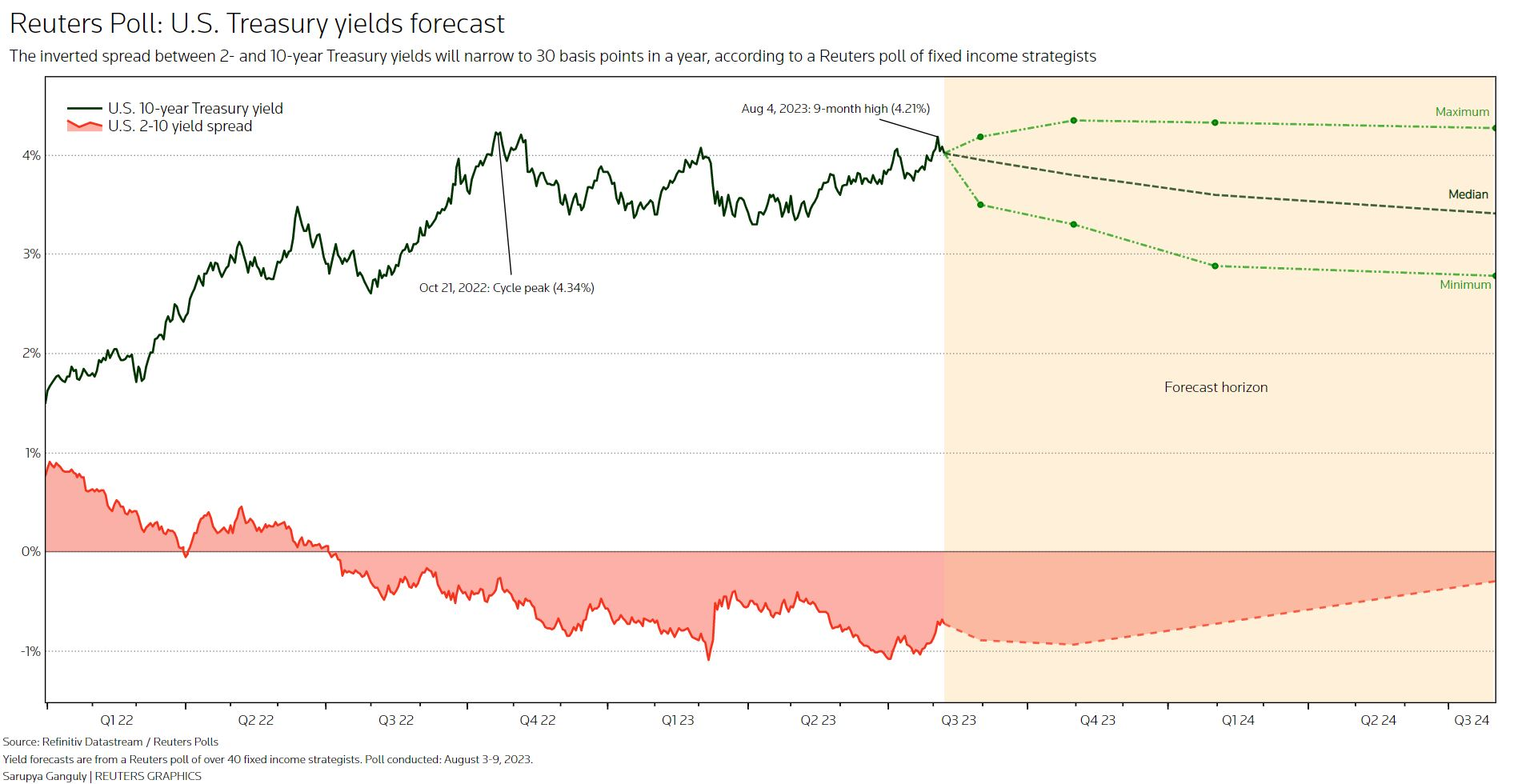 据路透调查的债券策略师,尽管有明显迹象表明美联储/不愿很快考虑降息,但美国国债收益率在未来几个月仍将下跌,他们表示10年期国债收益率不会再次触及周期峰值。