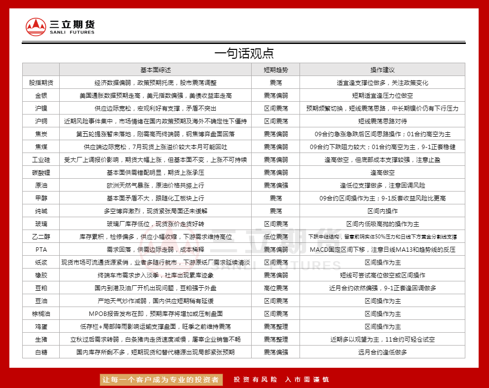 标题:三立期货8月10日沪金、沪银、原油、有色金属等期货操作建议