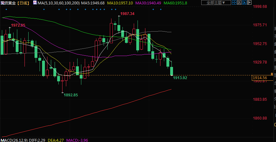 商品收盘情况:美国期金收低0.5%,结算价报每盎司1950.60美元。