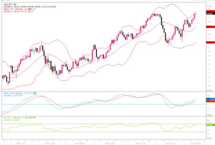 一度触及五周最高的144.81圆,盘尾报144.75,上涨0.72%。隔夜美国公布的7月份通胀数据CPI,打消了市场希望美联储将停止加息的期盼,继续巩固了9月份将会加息25个基点的预期。为此,