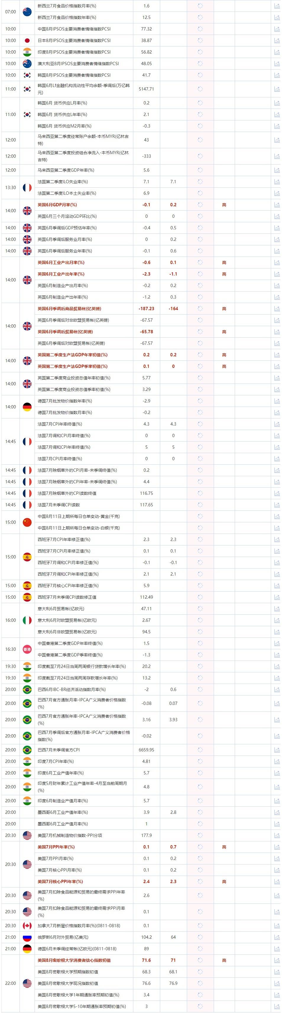 20:30 美国7月核心PPI年率(%) , 前值 2.4 , 预期值 2.3 , 公布值:待发布20:30 美国7月扣除食品能源和贸易的最终需求PPI年率(%) , 前值 2.6 , 预期值 -- , 公布值:待发布