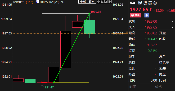 现货黄金跳涨逾8美元至1930.02美元/盎司。