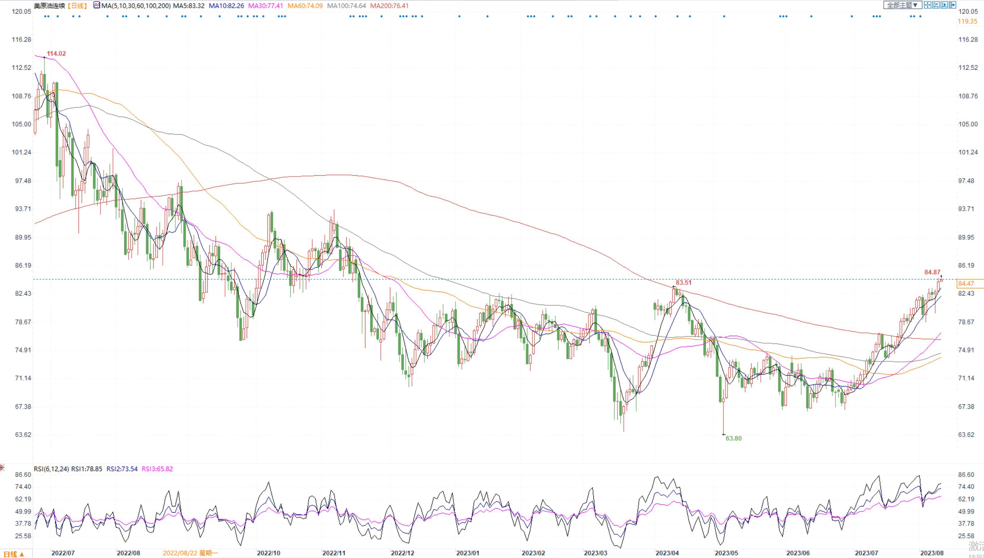 周四国内原油价格继续上涨。上周欧佩克及其减产同盟国联合部长监测委员会没有做出进一步减产举措,但是支持沙特等国自愿额外减产延长到9月份的决定。通用电气公司的油田服务机构贝克休斯公布的数据显示,截至8月4日的一周,美国在线钻探油井数量525座,比前周减少4座;比去年同期减少73座。美国能源信息署在刚刚公布的8月份《短缺能源展望》中预计,2023年美国国内生产总值(GDP)将增长1.9%,高于此前预测的1.5%。美国战略原油储备得以补充,美国原油净进口量增加2000万桶,美国原油库存增长,汽油库存和馏分油库存减少,美国能源信息署数据显示,截至2023年8月4日当周,包括战略储备在内的美国原油库存总量7.93376亿桶,比前一周增长684.6万桶;美国商业原油库存量4.45622亿桶,比前一周增长585.1万桶;美国汽油库存总量2.1642亿桶,比前一周下降266.1万桶;馏分油库存量为1.15447亿桶,比前一周下降170.6万桶。备受关注的美国俄克拉荷马州库欣地区原油库存3463.9万桶,增长15.9万桶。过去的一周,美国石油战略储备3.47754亿桶,增加了100万桶。沙特内阁周二表示,重申支持欧佩克及其盟友采取预防措施,以稳定市场。技术面,油价后市仍然维持谨慎看涨,关注WTI原油在85美元附近阻力情况。操作建议:前期多单可止盈减仓。