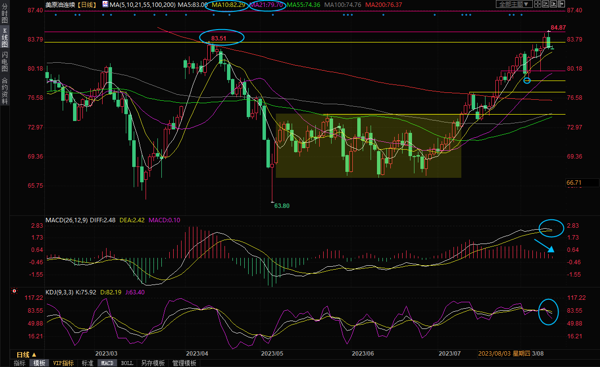 短线的话,初步支撑参考10日均线82.30附近,周一低点支撑在81.52附近,然后是80整数关口支撑,本周低点支撑也在该位置附近,上周低点支撑在78.68附近,如果回落至该位置下方,则增加后市看空信号。