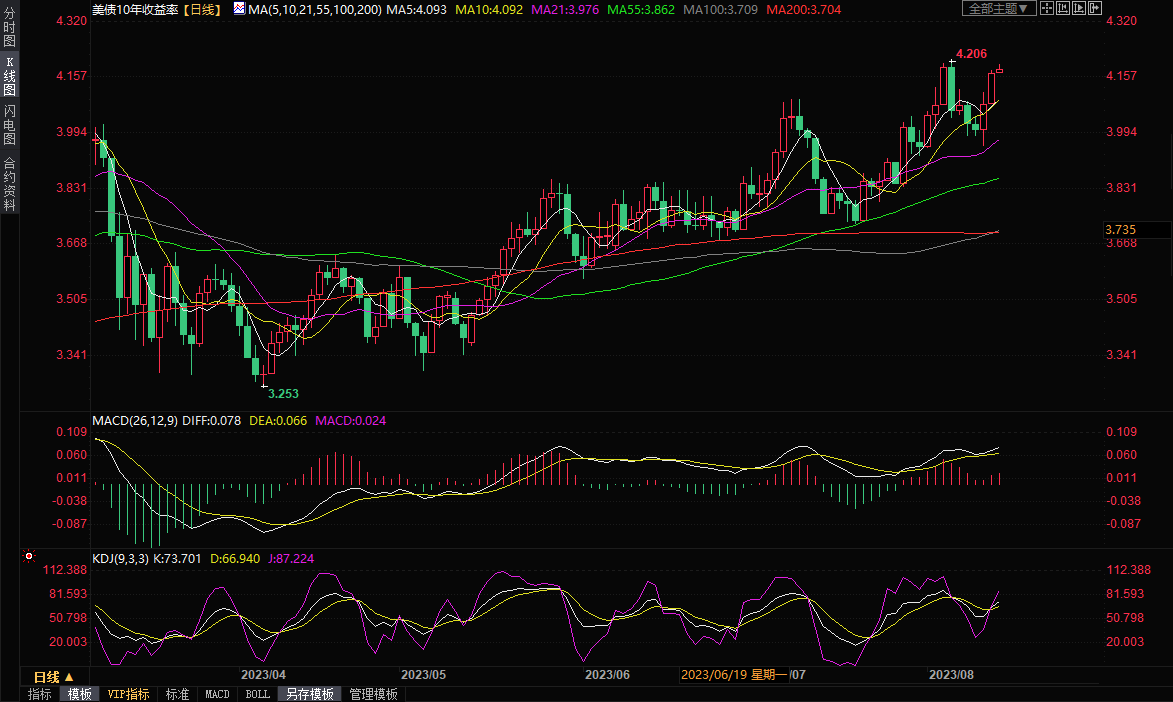 10年期美债收益率上周五上涨9个基点,至4.168%,周一延续涨势,最高触及4.195%;8月4日曾触及4.206%的11月8日以来最高。对利率敏感的两年期国债收益率上周五上升8个基点,至4.900%。该收益率7月6日曾触及5.120%的2007年6月以来最高水平。
