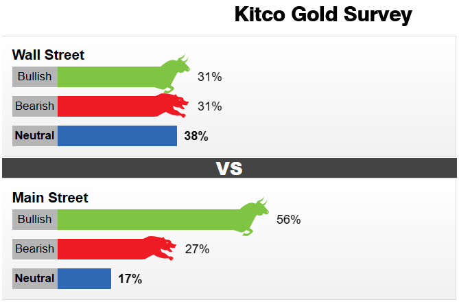 13位华尔街分析师参加了Kitco News黄金调查。在一次几乎完全势均力敌的投票中,看涨和看跌各获得4票,即31%。与此同时,5位分析师(占38%)对未来一周黄金持中性看法。