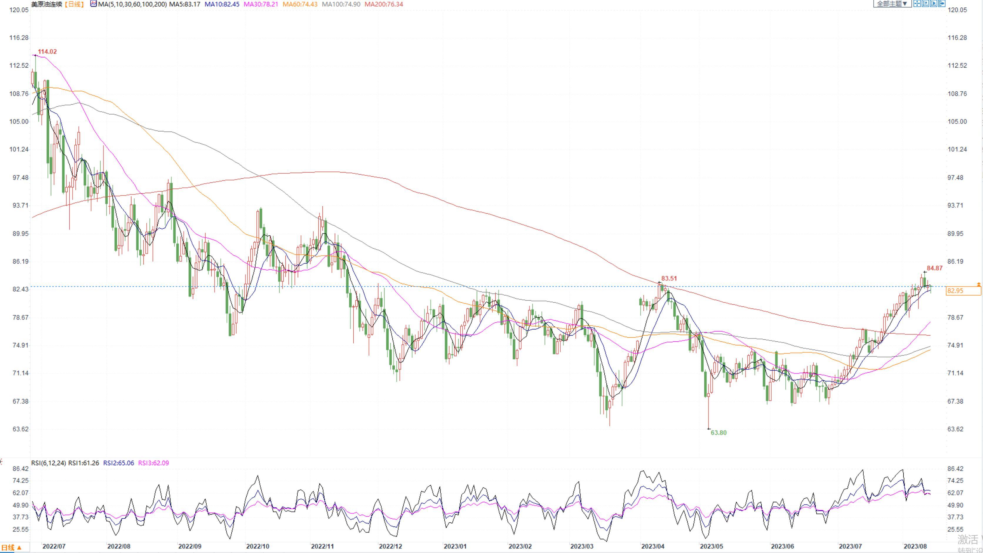 周一国内原油价格冲高回落,主力合约SC2309报收于656.7元/桶,上涨17.7元/桶,涨幅2.77%,持仓减少4833手。国际能源署预测全球需求创纪录、供应趋紧,上周五油价继续走高,推动油价连续第七周上涨。国际能源署周五发布了8月份《石油市场月度报告》。报告认为,在经济不振限制2024年全球需求增长之前,欧佩克及其减产同盟国供应削减可能会侵蚀今年剩余时间的库存,可能会推动油价进一步上涨。国际能源署报告称,受到夏季航空旅行增加、发电用石油消耗量增多以及中国石化业强劲的推动,全球石油需求正在创下历史新高。尽管全球原油供需仍然偏紧,但是美国债务问题仍然引起市场担忧。当前,虽然人民币贬值提振国内油价,但是内外盘油价走势已经出现严重背离,国际油价遇阻回调背景下,国内油价恐难继续走强。技术面,油价冲高回落,短期或高位震荡调整。操作建议:震荡偏空。