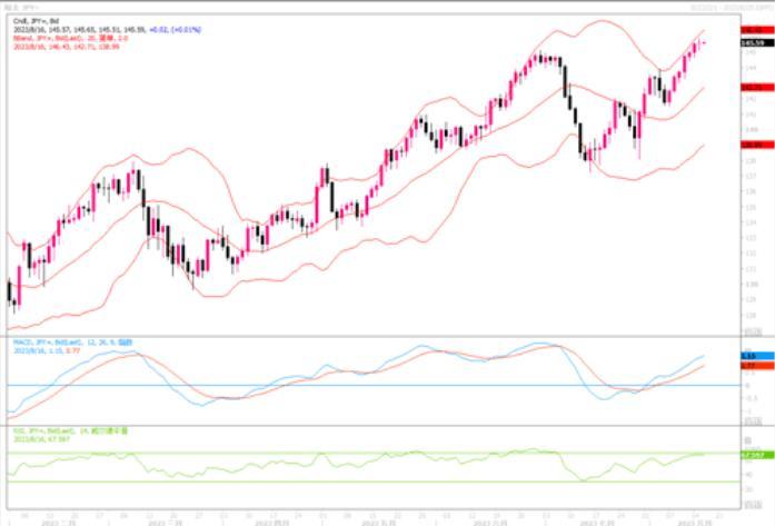 盘中升至九个月新高145.865,尾盘报收于145.66。周二当天,虽然日本公布的二季度实际GDP年化季环比初值录得6%增长,大幅超出市场预期的2.9%和前值3.7%,但非但没能给到日元任何刺激抬捧作用,日元反而继续走弱。这主要是当日美国7月份零售销售数据据环比继续增长,继续令投资者看到美国经济发展充满了韧性,也使到投资者确信,为达到将通胀率压制到核心目标范围内,美联储将会维持高利率相当一段时期。如此一来,恐会继续刺激套利交易中对美元的追逐。当前,如果日本央行不出面干预,将极大可能刺激美元/日元继续勇闯高峰,上方继续前进的目标将瞄向148-150区域。但是4小时图上,则有顶背离迹象,需防范短期内的调整性回落行情的发生。
