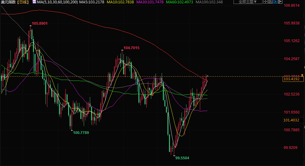 美元指数上涨0.213%,报103.420。欧元下跌0.22%,报1.08795美元。
