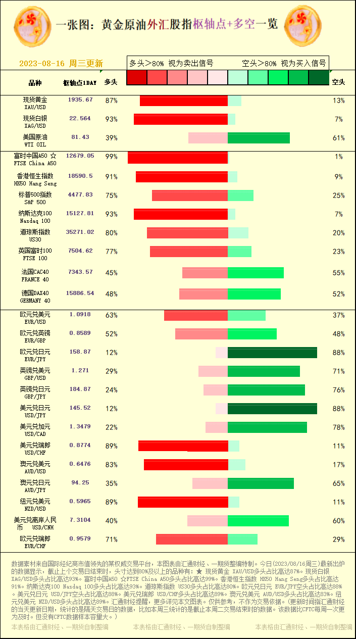 标题:一张图:2023/08/16黄金原油外汇股指"枢纽点+多空占比"一览