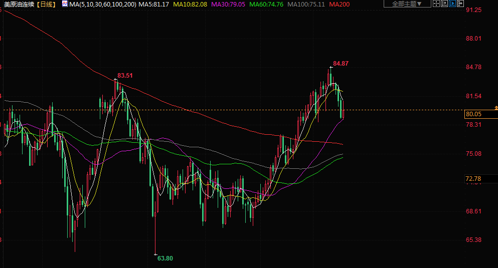 布伦特原油期货涨0.8%,报每桶84.12美元;美国原油涨1.3%,报每桶80.93美元。