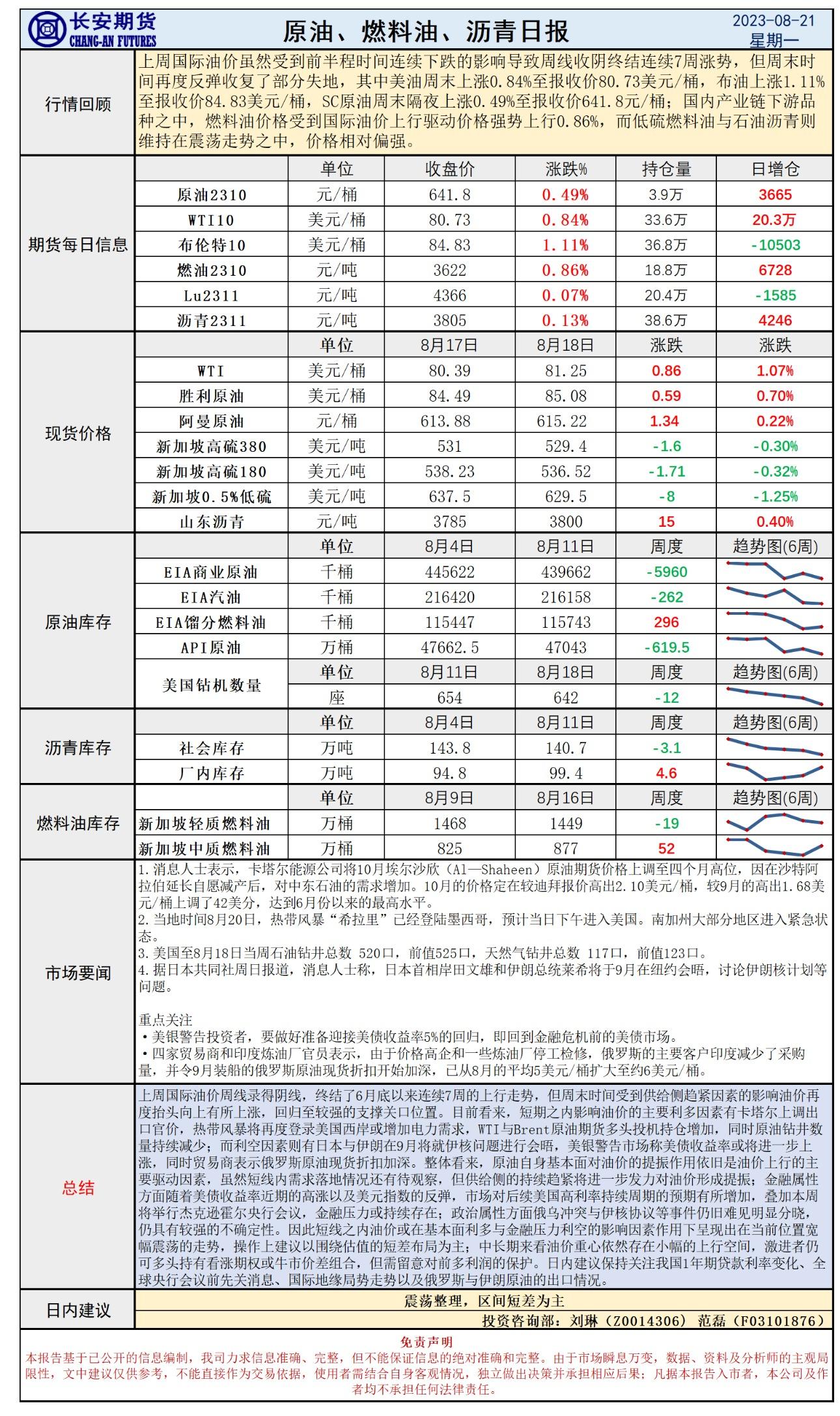 标题:长安期货8月21日原油早评:油价终结7周涨势后小幅反弹,市场消息清淡或维持震荡