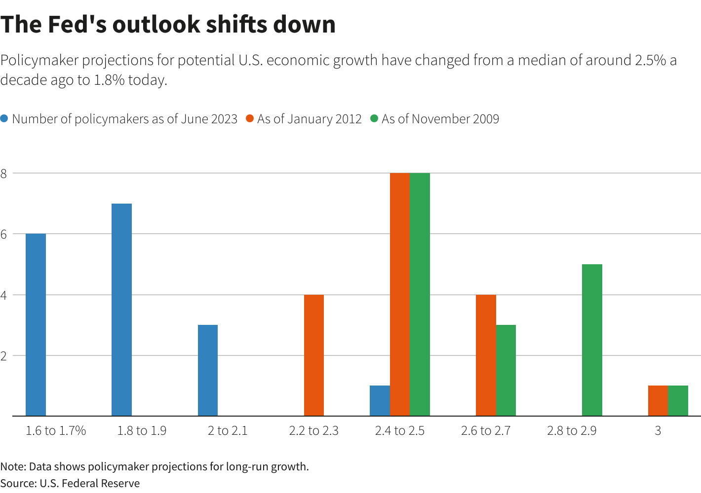 美联储官员不太可能放弃看淡美国潜在经济增长的观点。目前,人口增长放缓是影响美联储增长前景看法的一大因素,移民仍然是一个充满政治色彩的问题,而增长的另一个关键驱动力--生产率,则是很难预期。