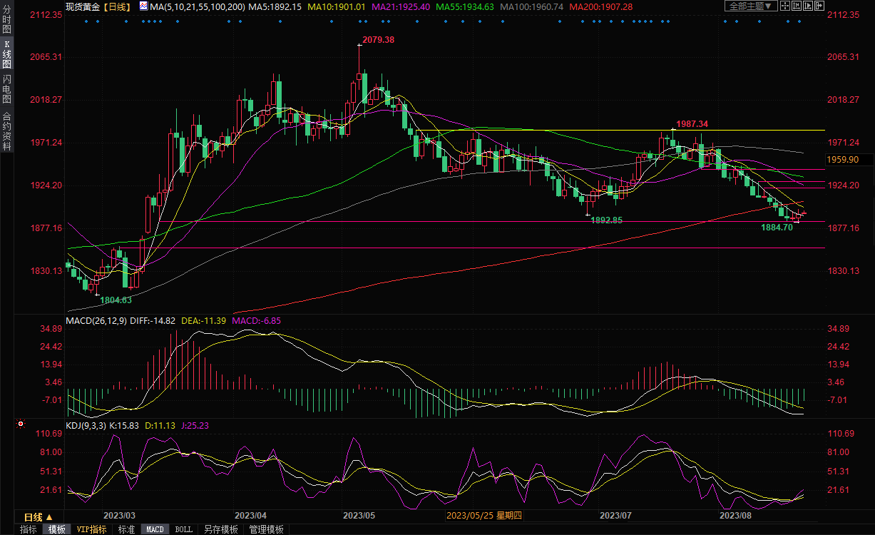 现货黄金窄幅震荡,目前交投于1895.44美元/盎司附近。隔夜金价反弹0.26%,收报1894.50美元/盎司附近,因为在本周美联储官员讲话和杰克逊霍尔年会前,一些空头获利了结,另外对经济衰退等因素的担忧,也吸引一些逢低买盘支撑金价,金价短线震荡筑底的机会有所增加。