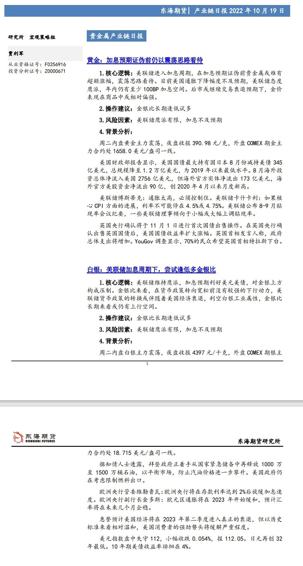标题:【东海期货10月19日产业链日报】贵金属篇:美联储官员发言鹰派,金银震荡
