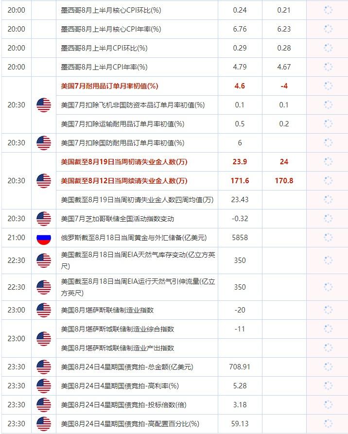 20:30 美国截至8月19日当周初请失业金人数(万) , 前值 23.9 , 预期值 24 , 公布值:待发布20:30 美国截至8月12日当周续请失业金人数(万) , 前值 171.6 , 预期值 170.8 , 公布值:待发布20:30 美国截至8月19日当周初请失业金人数四周均值(万) , 前值 23.43 , 预期值 -- , 公布值:待发布