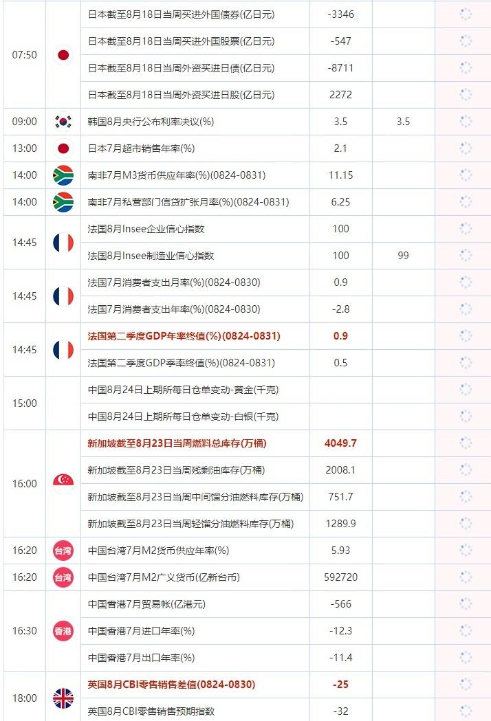 09:00 韩国8月央行公布利率决议(%) , 前值 3.5 , 预期值 3.5 , 公布值:待发布