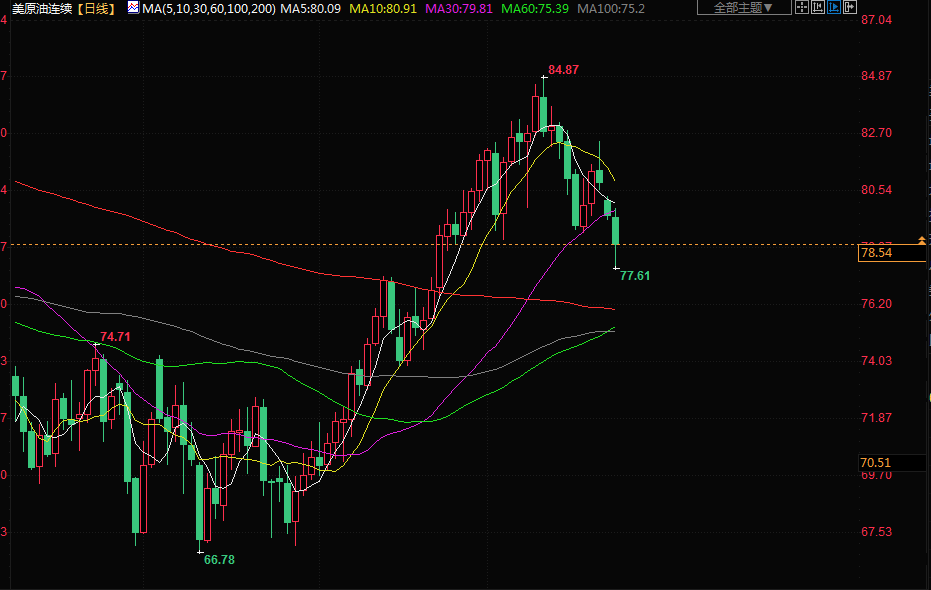 布伦特原油期货下跌0.98%,报每桶83.21美元,盘初一度大跌2.5%。美国原油期货下跌0.9%,报78.89美元,盘中一度重挫3.4%。
