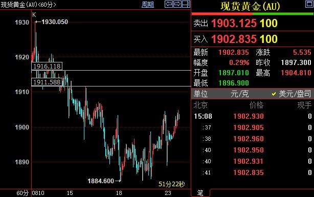现货黄金上涨0.35%至1903.81美元/盎司;COMEX期金主力合约上涨0.34%至1932.5美元/盎司;