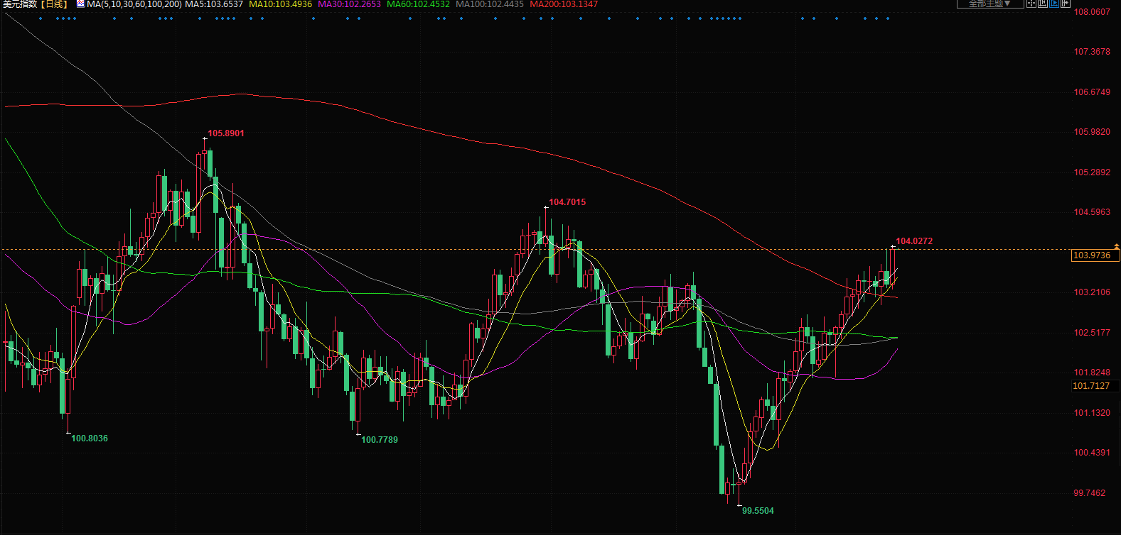 美元指数上涨0.63%,报103.99,为6月8日以来最高。
