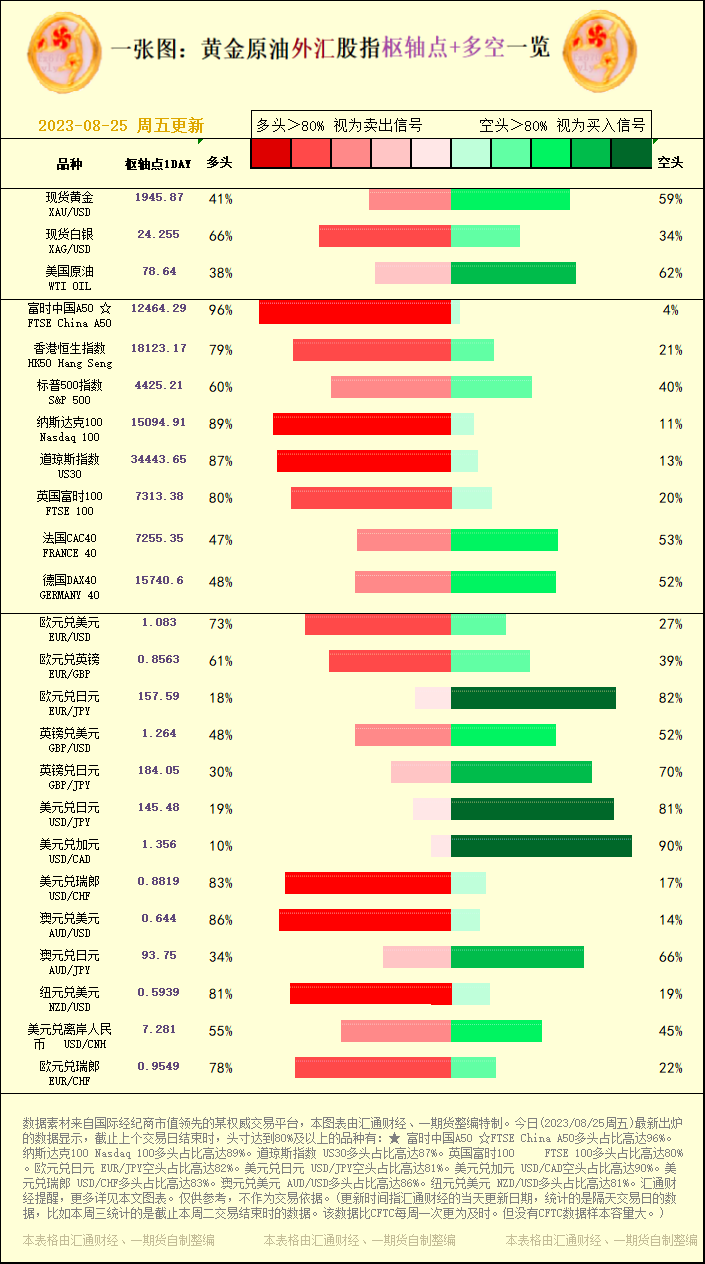 标题:一张图:2023/08/25黄金原油外汇股指"枢纽点+多空占比"一览
