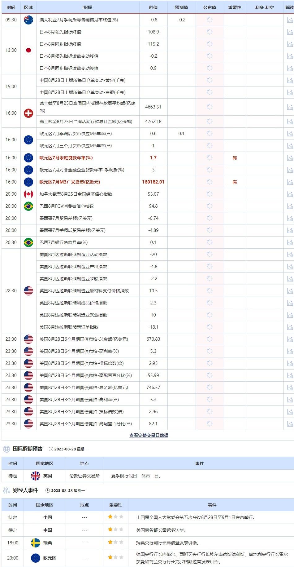 16:00 欧元区7月M3广义货币(亿欧元) , 前值 160182.01 , 预期值 -- , 公布值:待发布20:00 加拿大截至8月25日全国经济信心指数 , 前值 53.07 , 预期值 -- , 公布值:待发布