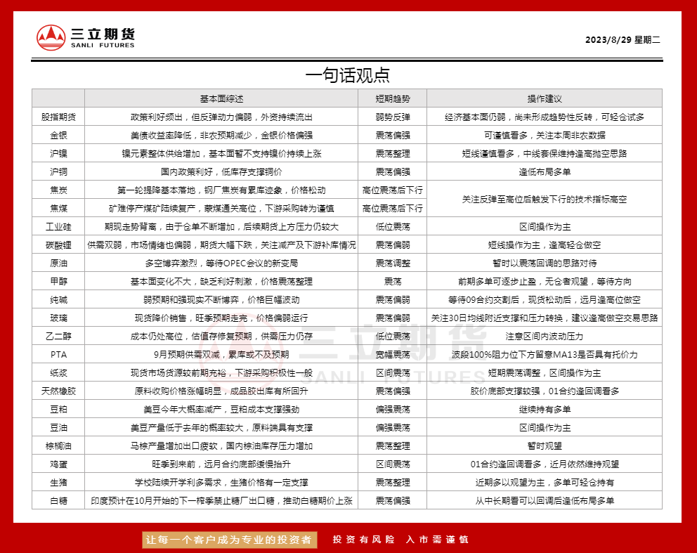 标题:三立期货8月29日沪金、沪银、原油、有色金属等期货操作建议