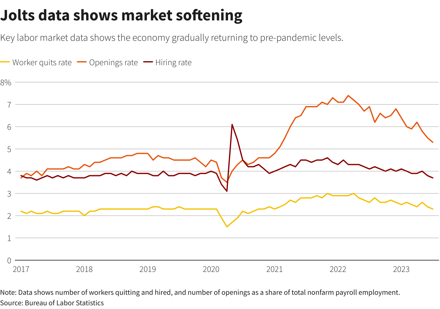 上个月的招聘率创2020年4月以来最低。