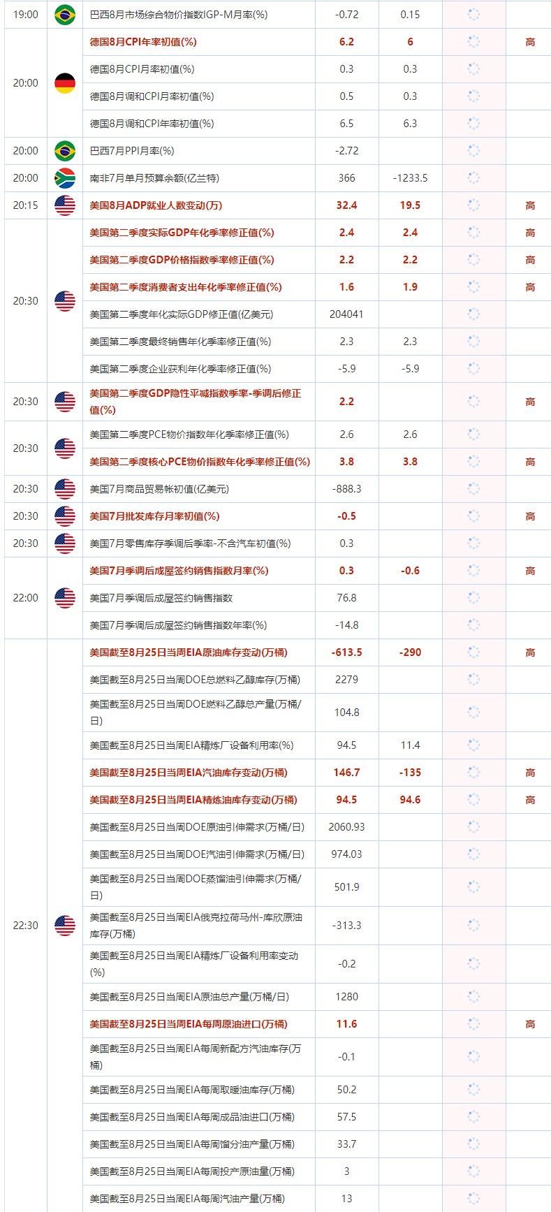 20:15 美国8月ADP就业人数变动(万) , 前值 32.4 , 预期值 19.5 , 公布值:待发布20:30 美国第二季度实际GDP年化季率修正值(%) , 前值 2.4 , 预期值 2.4 , 公布值:待发布20:30 美国第二季度GDP价格指数季率修正值(%) , 前值 2.2 , 预期值 2.2 , 公布值:待发布20:30 美国第二季度消费者支出年化季率修正值(%) , 前值 1.6 , 预期值 1.9 , 公布值:待发布20:30 美国第二季度年化实际GDP修正值(亿美元) , 前值 204041 , 预期值 -- , 公布值:待发布