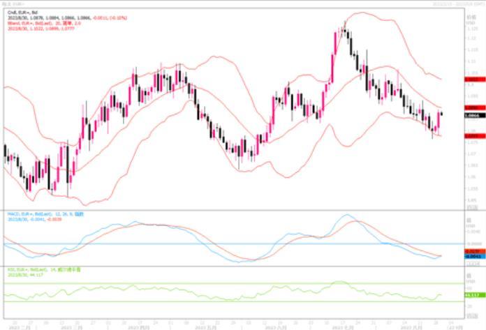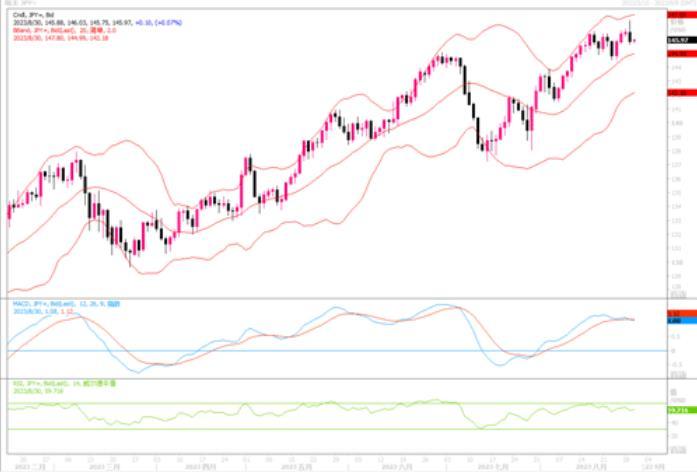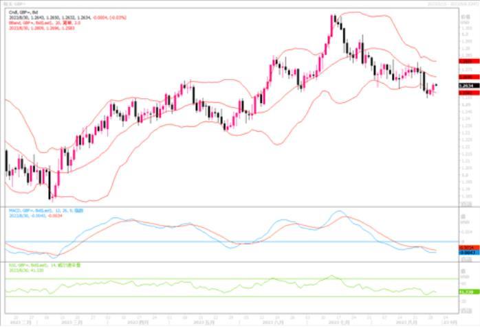 上涨0.56%,报收盘于1.0880。因为数据显示美国7月职位空缺下降,7月最后一天,美国衡量劳动力需求的职位空缺减少了33.8万个,至882.7万个,为2021年3月以来的最低水平。这些数据增强了人们对美联储在即将到来的9月19-20日政策会议上不会加息的信心,投资者仍在警惕任何显示货币紧缩滞后影响的迹象。当然了,本周五的非农则是显示劳动力市场状况的关键数据,投资者们正密切关注该数据的即将到来。而周四将公布的欧元区通胀数据可能是欧洲央行是否在9月会议上加息的关键,后者将可能为欧元的近期走势定下基调。日线图上,欧元/美元整体上还处于下降通道之中,汇价也受压于布林带通道中轨线之下。只是技术指标上,MACD有形成金叉之势,绿色动能柱也开始有所收敛,显示欧元的下跌势头有所减弱并进入了调整阶段。后续走势状况则有待于看本周欧美一些重要经济数的结果了。若向上能穿破120日均线1.0920水位的压制,则有望扭转跌势。相反,则恐怕还是要继续陷入下降通道内运行。
