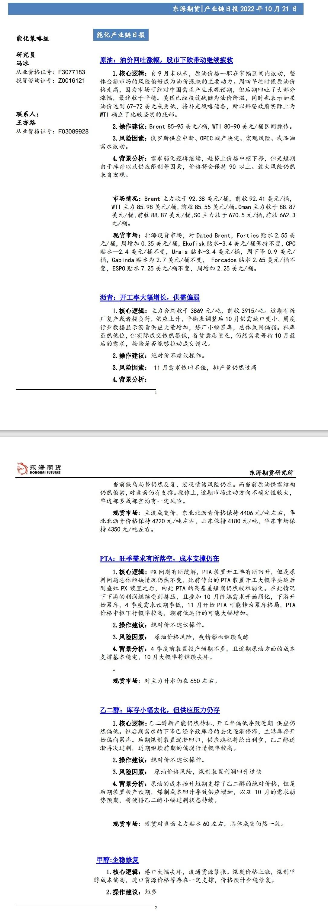 【东海期货10月21日产业链日报】能化篇:油价回吐涨幅,股市下跌带动继续疲软