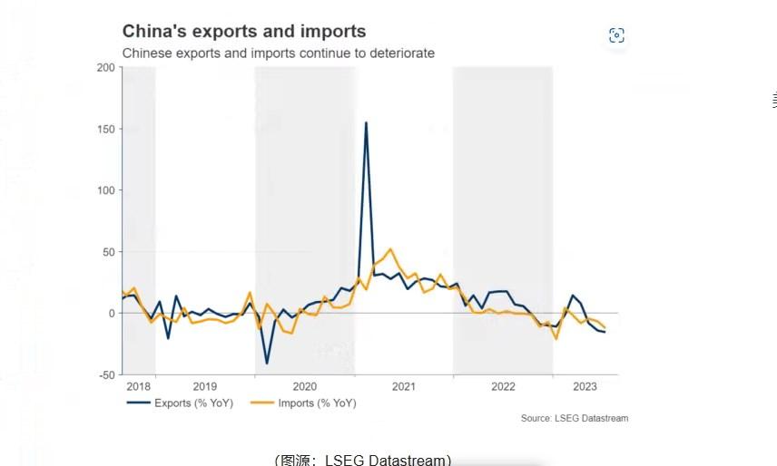 接下来将是周四公布的8月份贸易平衡数据,预计出口同比增速将从7月份的-14.5%放缓至-10%。 进口同比预计将从7月份的-12.4%进一步收缩11%。