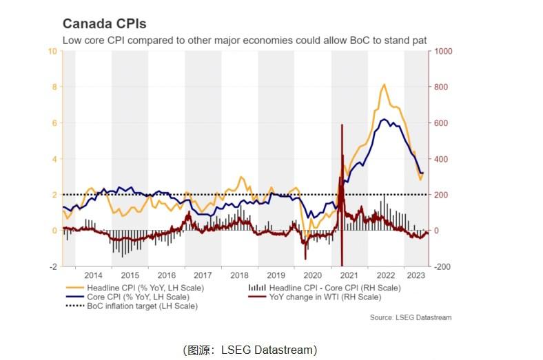 通货膨胀率高于央行2%的目标,但由于加拿大的核心利率比其他主要经济体的潜在通货膨胀率更接近这个数字,而且加拿大央行在目标周围保持1-3%的弹性范围,官员们现在可能有足够的时间观望,看看过去的加息是否仍在对价格施加下行压力。
