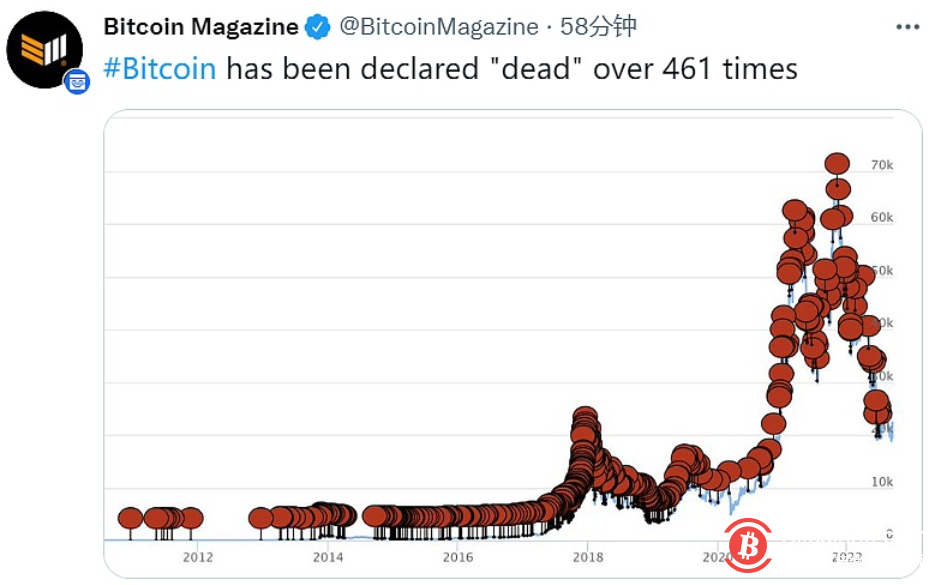 Bitcoin Magazine发推称,比特币被宣布“死亡”超过461次。