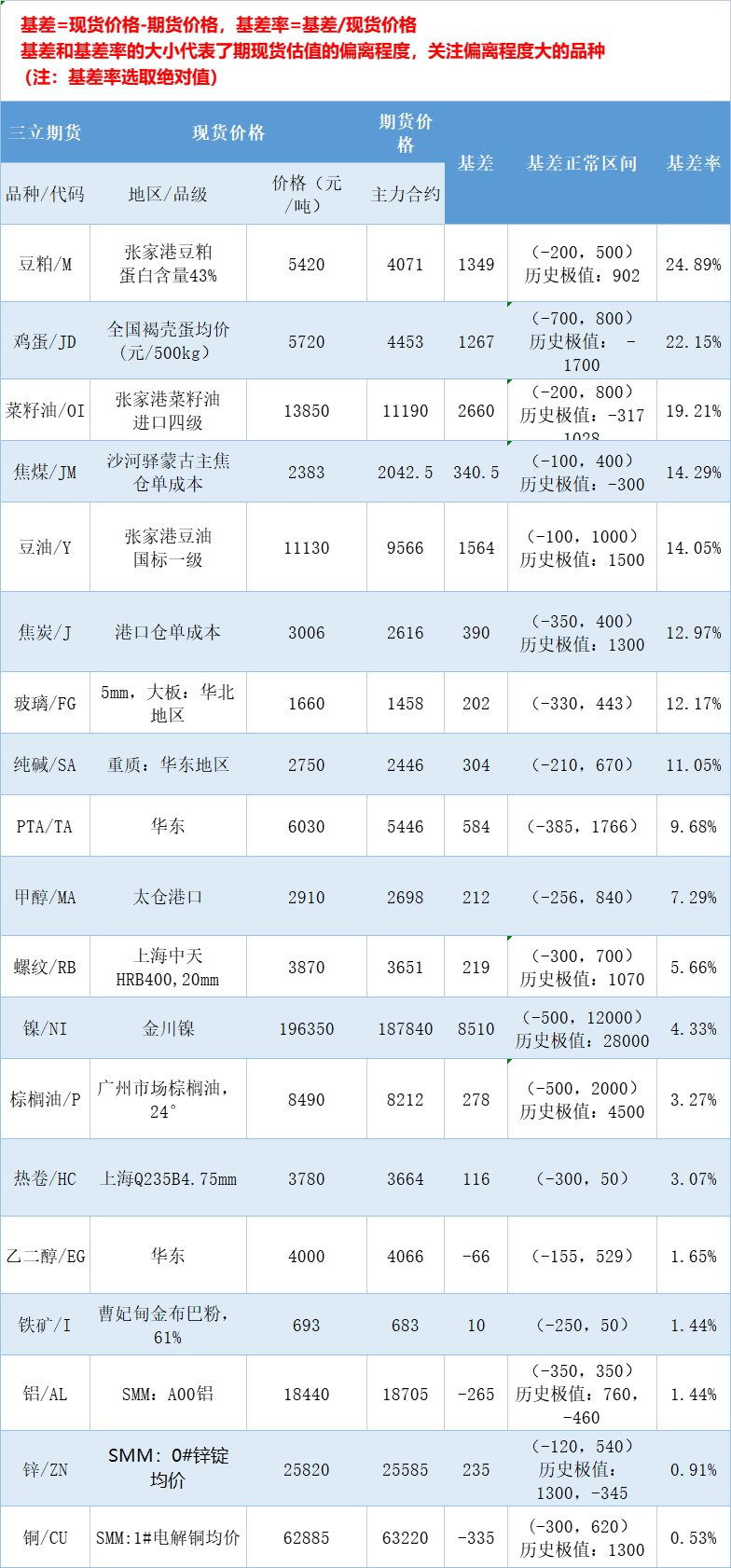 三立期货10月21日基差:一张图尽览有色金属、黑色系、能源化工和农产品基差(按基差率从大到小排序)