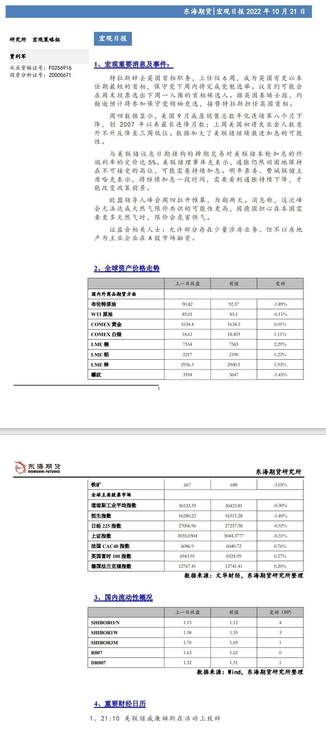 标题:【东海期货10月21日宏观日报】:美联储加息预期进一步强化,美债收益率再创新高
