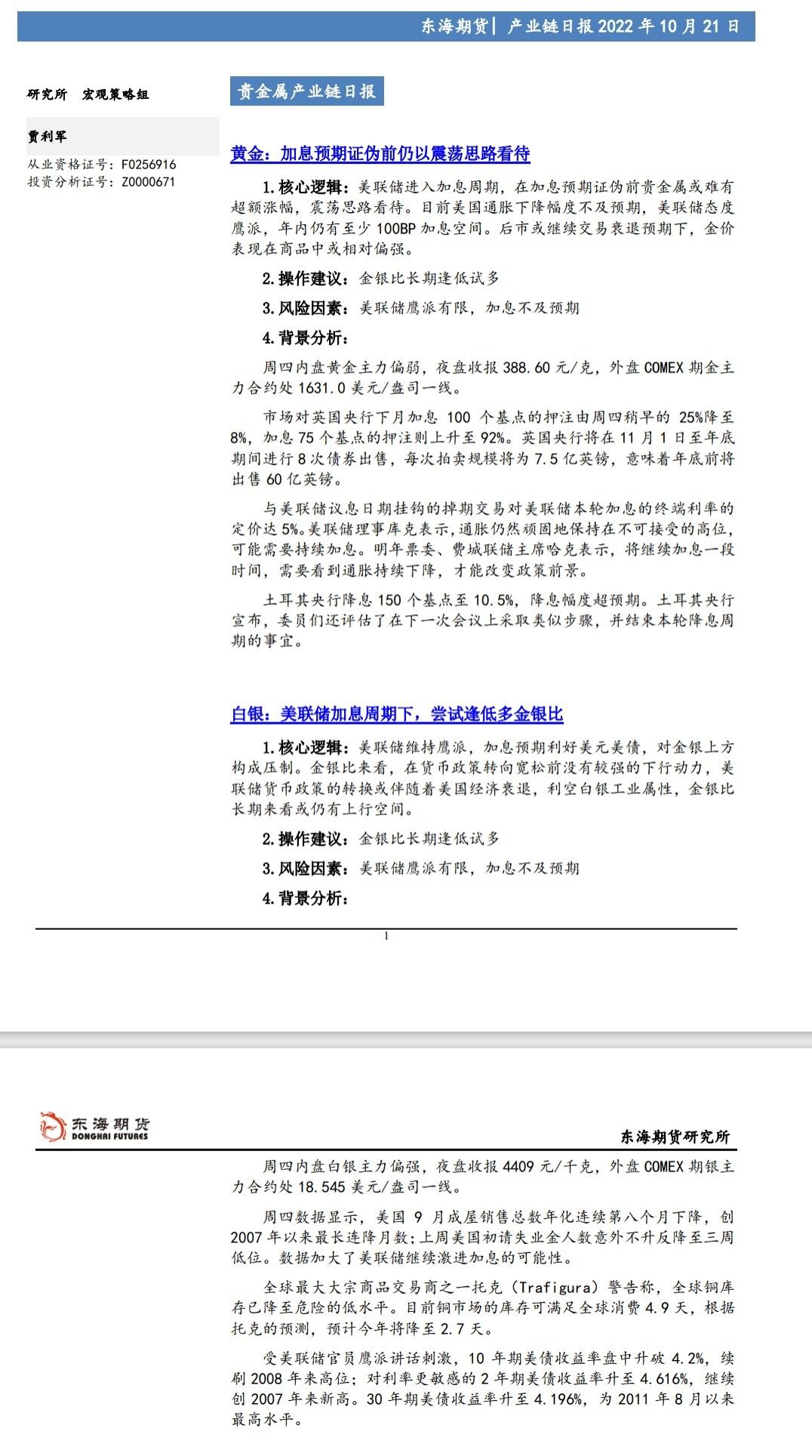 标题:【东海期货10月21日产业链日报】贵金属篇:10年期美债收益率延续涨势,金银震荡