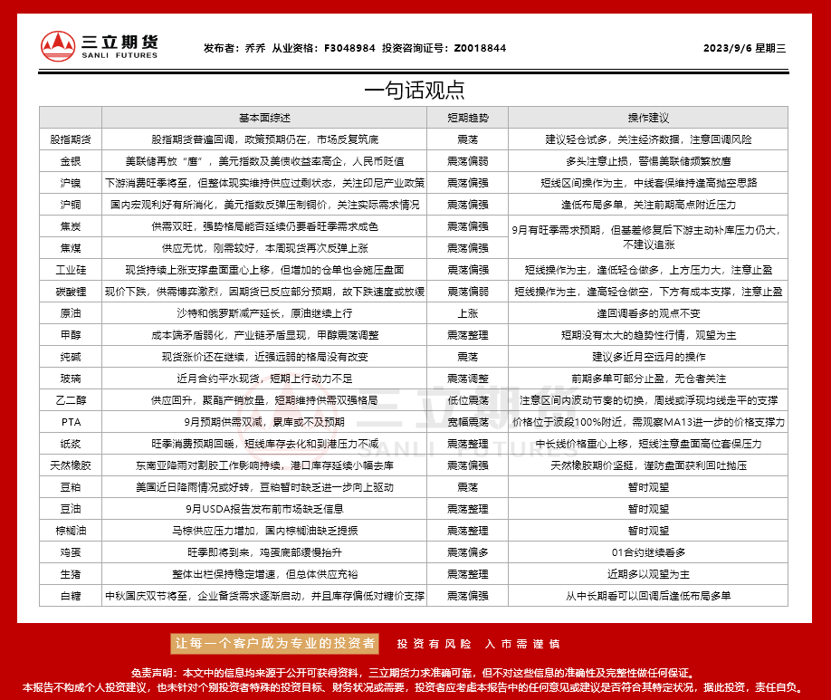 标题:三立期货9月6日沪金、沪银、原油、有色金属等期货操作建议