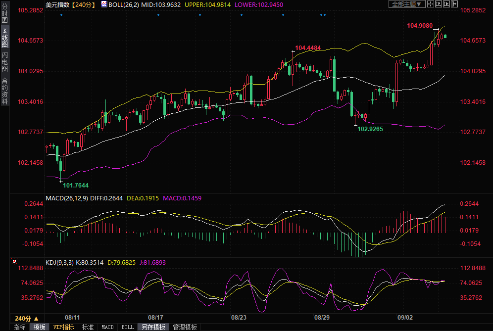 美元指数周二上涨0.66%,盘中最高触及104.90,为3月15日以来新高,收报104.78,。周三(9月6日)亚市早盘,美元指数窄幅震荡,目前交投于104.76附近。现报104.76。